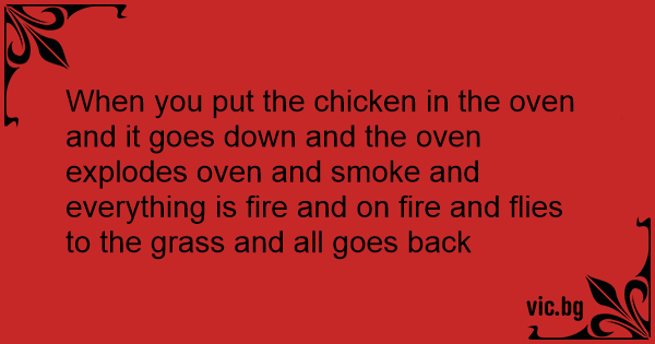 When you put the chicken in the oven and it goes down and the oven explodes oven and smoke and everything is fire and on fire and flies to the grass and all goes back