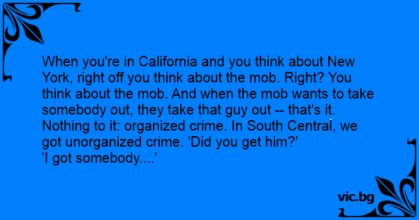 When you're in California and you think about New York, right off you think about the mob. Right? You think about the mob. And when the mob wants to take somebody out, they take that guy out -- that's it. Nothing to it: organized сriме. In South Central, we got unorganized сriме. 'Did you get him?'