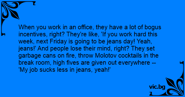 When you work in an office, they have a lot of bogus incentives, right? They're like, 'If you work hard this week, next Friday is going to be jeans day! Yeah, jeans!' And people lose their mind, right? They set garbage cans on fire, throw Molotov cocktails in the break room, high fives are given out everywhere -- 'My job suскs less in jeans, yeah!'