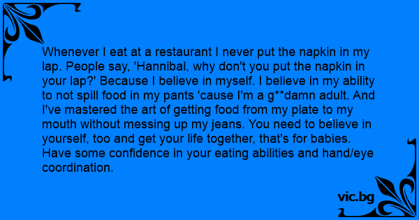 Whenever I eat at a restaurant I never put the napkin in my lap. People say, 'Hannibal, why don't you put the napkin in your lap?' Because I believe in myself. I believe in my ability to not spill food in my pants 'cause I'm a g**dамn adult. And I've mastered the art of getting food from my plate to my mouth without messing up my jeans. You need to believe in yourself, too and get your life together, that's for babies. Have some confidence in your eating abilities and hand/eye coordination.
