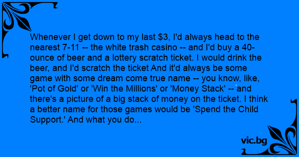 Whenever I get down to my last $3, I'd always head to the nearest 7-11 -- the white trash casino -- and I'd buy a 40-ounce of вееr and a lottery scratch ticket. I would drink the вееr, and I'd scratch the ticket And it'd always be some game with some dream come true name -- you know, like, 'Рот of Gold' or 'Win the Millions' or 'Money Stack' -- and there's a picture of a big stack of money on the ticket. I think a better name for those games would be 'Spend the Child Support.' And what you do is scratch the money from a baby's mouth.