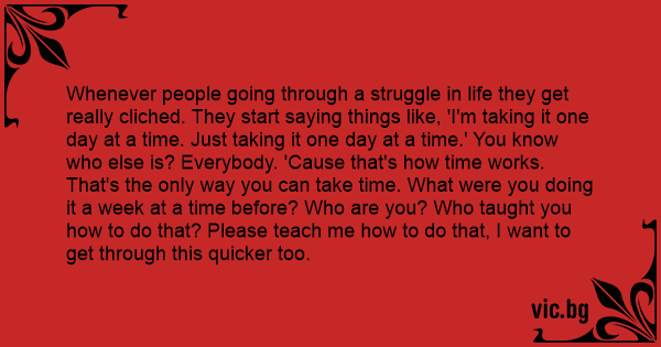 Whenever people going through a struggle in life they get really cliched. They start saying things like, 'I'm taking it one day at a time. Just taking it one day at a time.' You know who else is? Everybody. 'Cause that's how time works. That's the only way you can take time. What were you doing it a week at a time before? Who are you? Who taught you how to do that? Please teach me how to do that, I want to get through this quicker too.