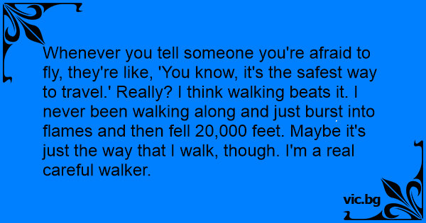 Whenever you tell someone you're afraid to fly, they're like, 'You know, it's the safest way to travel.' Really? I think walking beats it. I never been walking along and just burst into flames and then fell 20,000 feet. Maybe it's just the way that I walk, though. I'm a real careful walker.