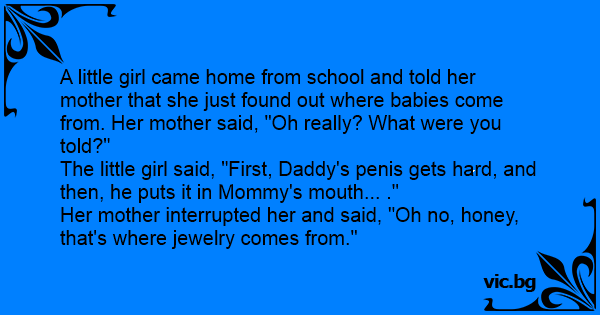- Anyu, anyu, tudom, hogyan lesz a kisbaba! - mondja az ötéves kislány az anyukájának. - Na, hogyan? - Úgy, hogy a kisfiú beleteszi a himbilimbijét az előtte térdelő kislány szájába! - Nem...