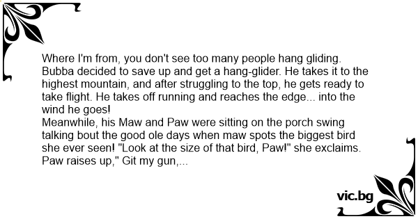 Where I'm from, you don't see too many people hang gliding. Bubba decided to save up and get a hang-glider. He takes it to the highest mountain, and after struggling to the top, he gets ready to take flight. He takes off running and reaches the edge... into the wind he goes!