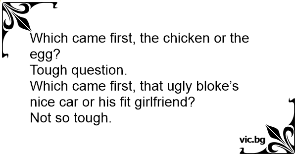 Which came first, the chicken or the egg?<br />Tough question.<br />Which came first, that ugly bloke’s nice car or his fit girlfriend?<br />Not so tough.