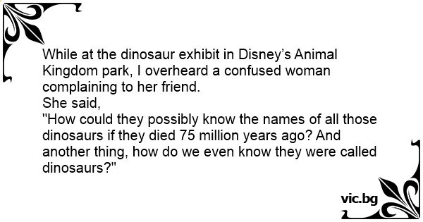 While at the dinosaur exhibit in Disney’s Animal Kingdom park, I overheard a confused woman complaining to her friend.