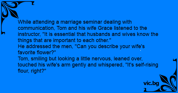 While attending a marriage seminar dealing with communication, Tom and his wife Grace listened to the instructor, "It is essential that husbands and wives know the things that are important to each other."