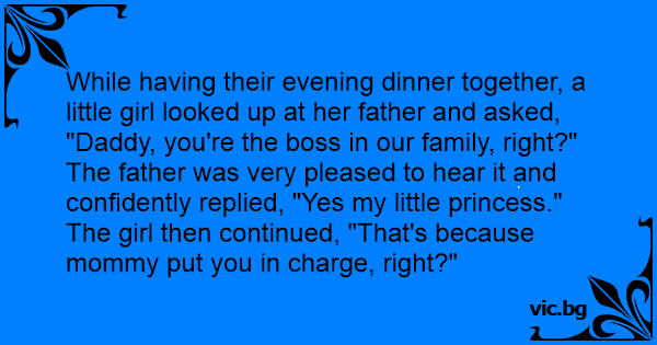 While having their evening dinner together, a little girl looked up at her father and asked, "Daddy, you're the boss in our family, right?"