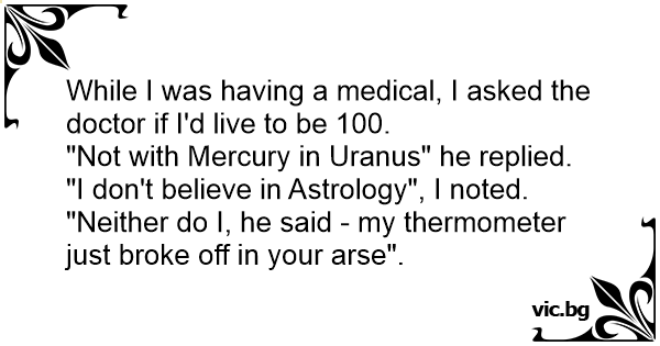 Patient to doctor "will I be ok Doc?" Doctor: "I doubt it. Mercury is in Uranus now" Patient: "I dont do that astrology stuff" Doctor:“Nor me. My thermometer just broke”