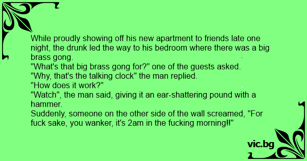 While proudly showing off his new apartment to friends late one night, the drunк led the way to his bedroom where there was a big brass gong.