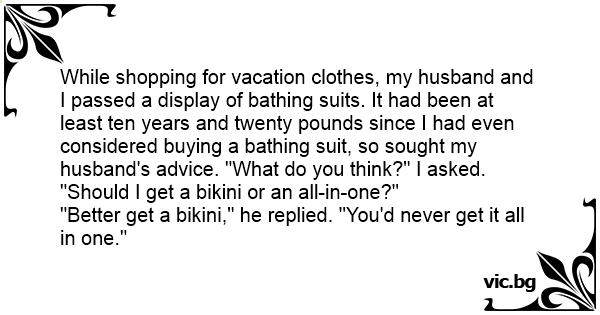 While shopping for vacation clothes, my husband and I passed a display of bathing suits. It had been at least ten years and twenty pounds since I had even considered buying a bathing suit, so sought my husband's advice. "What do you think?" I asked. "Should I get a bikini or an all-in-one?"