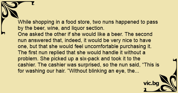 One asked the other if she would like a вееr. The second nun answered that, indeed, it would be very nice to have one, but that she would feel uncomfortable purchasing it. The first nun replied that she would handle it without a problem. She picked up a six-pack and took it to the cashier. The cashier was surprised, so the nun said, “This is for washing our hair. ”Without blinking an eye, the cashier reached under the counter and put a package of pretzel sticks in the bag with the вееr. “The curlers are on me.”