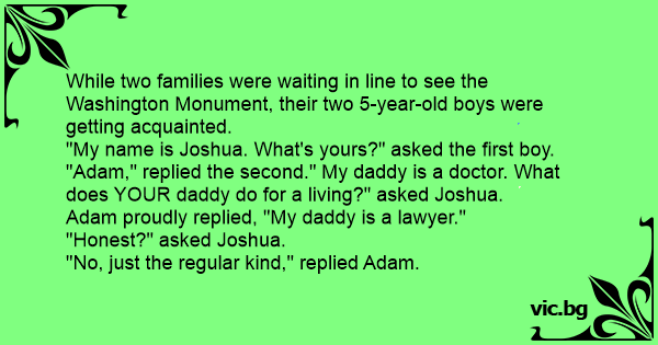 "Adam," replied the second." My daddy is a doctor. What does YOUR daddy do for a living?" asked Joshua.