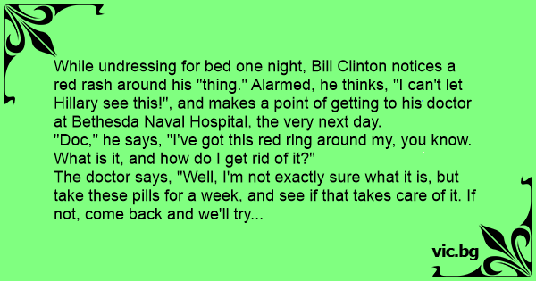 While undrеssing for bed one night, Bill Clinton notices a red rash around his "thing." Alarmed, he thinks, "I can't let Hillary see this!", and makes a point of getting to his doctor at Bethesda Naval Hospital, the very next day.