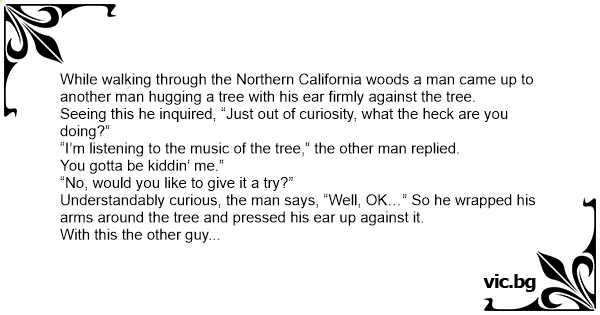 Understandably curious, the man says, “Well, OK…” So he wrapped his arms around the tree and pressed his ear up against it.