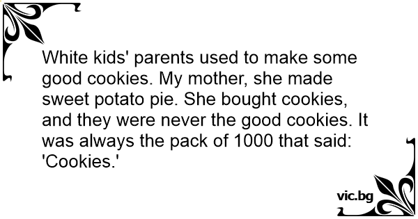 White kids' parents used to make some good cookies. My mother, she made sweet potato pie. She bought cookies, and they were never the good cookies. It was always the pack of 1000 that said: