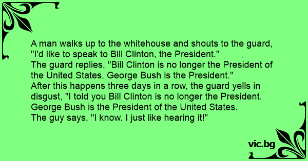 After this happens three days in a row, the guard yells in disgust, "I told you Bill Clinton is no longer the President. George Bush is the President of the United States.
