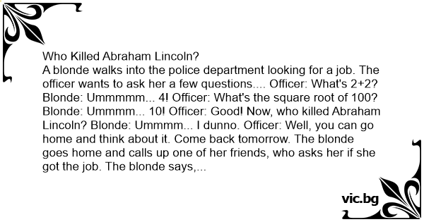 A blonde walks into the police department looking for a job. The officer wants to ask her a few questions.... Officer: What's 2+2? Blonde: Ummmmm... 4! Officer: What's the square root of 100? Blonde: Ummmm... 10! Officer: Good! Now, who killed Abraham Lincoln? Blonde: Ummmm... I dunno. Officer: Well, you can go home and think about it. Come back tomorrow. The blonde goes home and calls up one of her friends, who asks her if she got the job. The blonde says, excitedly, "Not only did I get the job, I'm already working on a мurdеr case!"