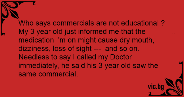Who says commercials are not educational ? My 3 year old just informed me that the medication I'm on might cause dry mouth, dizziness, loss of sight --- and so on.