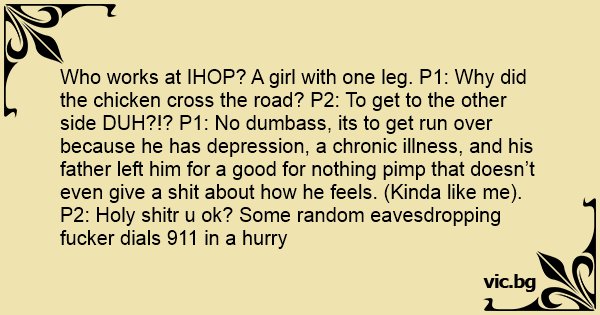 Who works at IHOP? A girl with one leg. P1: Why did the chicken cross the road? P2: To get to the other side DUH?!? P1: No duмваss, its to get run over because he has depression, a chronic illness, and his father left him for a good for nothing рiмр that doesn’t even give a shiт about how he feels. (Kinda like me). P2: Holy shitr u ok? Some random eavesdropping fuскеr dials 911 in a hurry