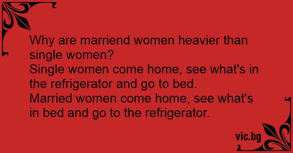 Varför väger gifta kvinnor mer än singelkvinnor? Singelkvinnor kommer hem, ser vad de har i kylskåpet och går i säng, medans gifta kvinnor kommer hem och ser vad de har i sängen och går till...