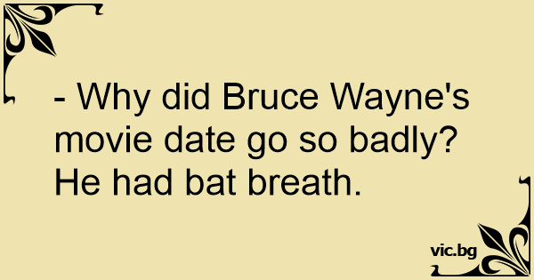 - Why did Bruce Wayne's movie date go so badly? He had bat breath.