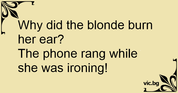 Egy szőke nő bemegy az orvoshoz, mert mindkét füle égőpiros. Kérdi tőle az orvos, hogy mi történt? - Éppen vasaltam, amikor megszólalt a telefon, és tévedésből a vasalót szorítottam a fülemhez -...
