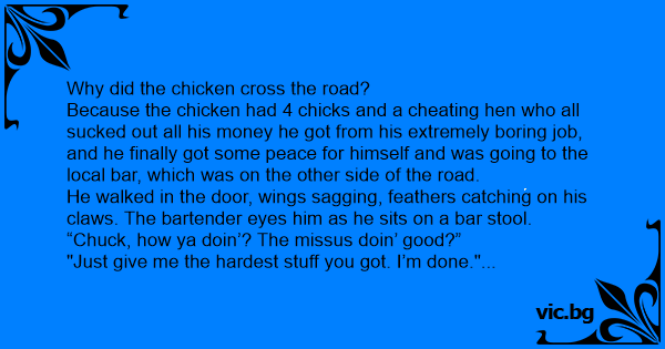 Because the chicken had 4 chicks and a cheating hen who all suскеd out all his money he got from his extremely boring job, and he finally got some peace for himself and was going to the local bar, which was on the other side of the road.