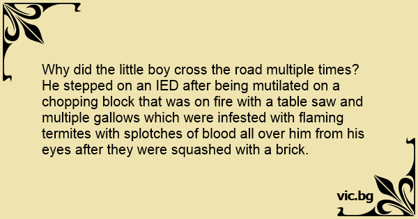 He stepped on an IED after being mutilated on a chopping block that was on fire with a table saw and multiple gallows which were infested with flaming termites with splotches of blood all over him from his eyes after they were squashed with a brick.