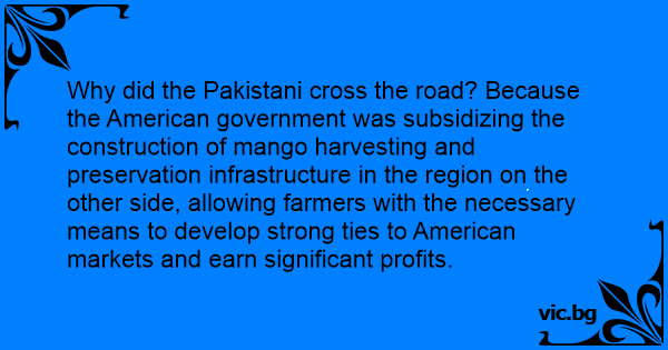 Why did the Pakistani cross the road? Because the American government was subsidizing the construction of mango harvesting and preservation infrastructure in the region on the other side, allowing farmers with the necessary means to develop strong ties to American markets and earn significant profits.