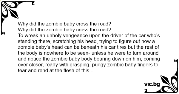 To wreak an unholy vengeance upon the driver of the car who's standing there, scratching his head, trying to figure out how a zombie baby's head can be beneath his car tires but the rest of the body is nowhere to be seen- unless he were to turn around and notice the zombie baby body bearing down on him, coming ever closer, ready with grasping, pudgy zombie baby fingers to tear and rend at the flesh of this self-same driver who ran his head over, on the dark and rain-swept road that snakes down from the castle of the madman who's creating an army of zombie babies to do his dark, libidinal bidding.