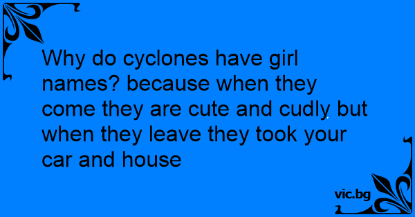 Why do cyclones have girl names? because when they come they are cute and cudly but when they leave they took your car and house