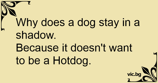 Why does a dog stay in a shadow.Because it doesn't want to be a Hotdog. 25 0 0 Animal Jokes Dog jokes