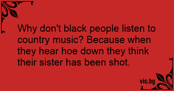 Why don't black people listen to country music? Because when they hear hое down they think their sister has been shot.
