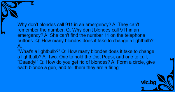 Why don't blondes call 911 in an emergency? A: They can't remember the number. Q: Why don't blondes call 911 in an emergency? A: She can't find the number 11 on the telephone buttons. Q: How many blondes does it take to change a lightbulb? A: