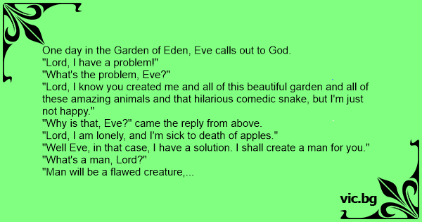 Eva og gud Eva henvendte sig til gud og sagde: Jeg har et problem!. Gud kigger på hende, og spørger til problemet. Kære gud, jeg ved, at du har givet mig alt, hvad jeg har brug for. Denne...