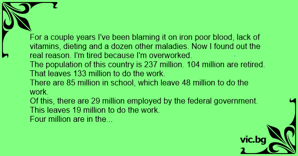 For a couple years I've been blaming it on iron poor blood, lack of vitamins, dieting and a dozen other maladies. Now I found out the real reason. I'm tired because I'm overworked.