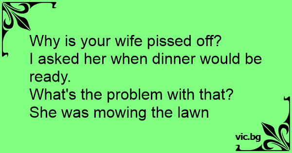 - Защо жена ти е бясна? - Попитах я кога ще е готова вечерята. - Какъв е проблемът с това? - Еми тя косеше тревата в градината.