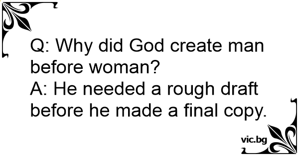 Q: Why did God create man before woman?<br />A: He needed a rough draft before he made a final copy.
