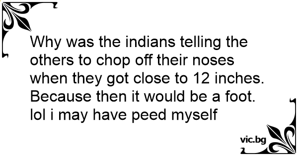 Why was the indians telling the others to chop off their noses when they got close to 12 inches. Because then it would be a foot. lol i may have peed myself