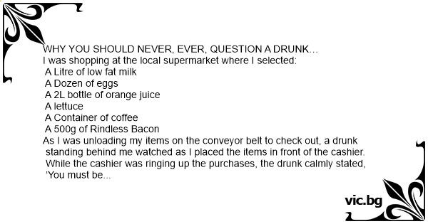 While the cashier was ringing up the purchases, the drunк calmly stated,