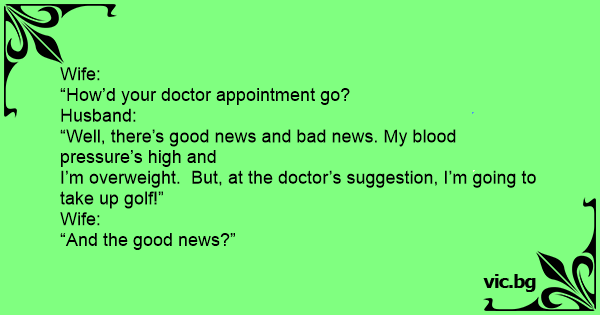 “Well, there’s good news and bad news. My blood pressure’s high and