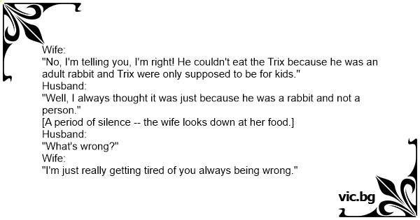 "No, I'm telling you, I'm right! He couldn't eat the Trix because he was an adult rabbit and Trix were only supposed to be for kids."