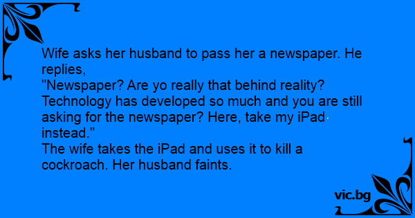 The wife takes the iPad and uses it to кill a cockroach. Her husband faints.