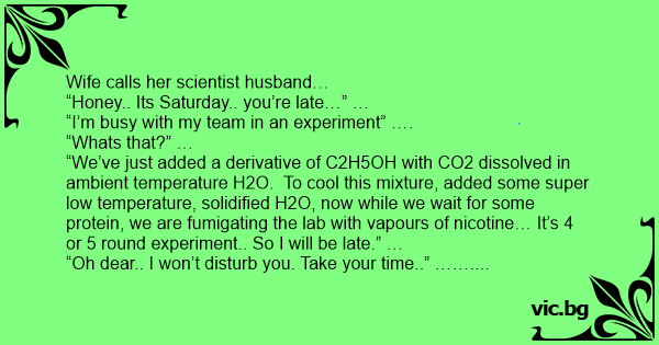 “We’ve just added a derivative of C2H5OH with CO2 dissolved in ambient temperature H2O. To cool this mixture, added some super low temperature, solidified H2O, now while we wait for some protein, we are fumigating the lab with vapours of nicotine… It’s 4 or 5 round experiment.. So I will be late.” …