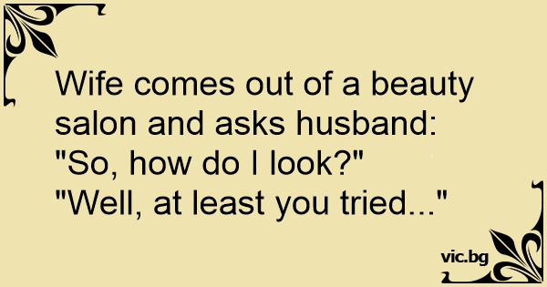 A férj várja a feleségét a kozmetikus előtt. Az asszony kilép az ajtón, a pasi ránéz, majd megszólal: - Hát... Legalább megpróbáltad...