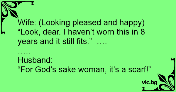 Wife: (Looking pleased and happy) “Look, dear. I haven’t worn this in 8 years and it still fits.” ….