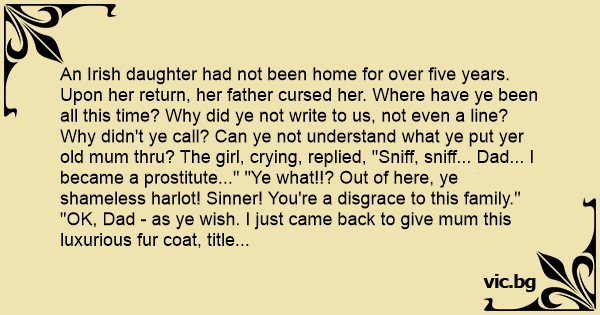 Upon her return, her father cursed her. Where have ye been all this time? Why did ye not write to us, not even a line? Why didn't ye call? Can ye not understand what ye put yer old mum thru? The girl, crying, replied, "Sniff, sniff... Dad... I became a рrоsтiтuте..." "Ye what!!? Out of here, ye shameless harlot! Sinner! You're a disgrace to this family." "OK, Dad - as ye wish. I just came back to give mum this luxurious fur coat, title deed to a ten bedroom mansion plus a savings certificate for $5 million." "For me little brother, this gold Rolex and for ye daddy, the sparkling new Mercedes limited edition convertible that's parked outside plus a membership to the country club... (takes a breath)... and an invitation for ye all to spend New Years' Eve on board my new yacht in the Riviera, and..." "Now what was it ye said ye had become?" says dad. Girl, crying again, "Sniff, sniff....a рrоsтiтuте dad! Sniff, sniff. "Oh! Be Jesus! Ye scared me half to death, girl! I thought ye said a Protestant. Come here and give yer old man a hug."