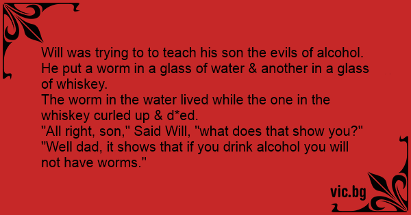 Решила учителката да покаже на децата вредното влияние на алкохола. Събрала ги в класната стая и взела в една ръка купичка пълна с водка, а в другата един червей. Топнала тя червея във водката, а той се сгърчил и умрял.